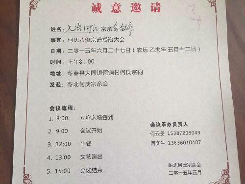 湖北蕲春县蕲北何氏宗亲会八修何氏宗谱授谱大会邀请函
