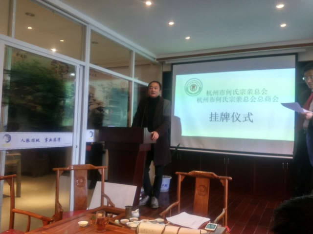 2017年2月18日(农历正月廿二)上午,杭州市何氏宗亲总会、杭州市何氏宗亲总会总商会(“两会”秘书处)挂牌仪式在杭州萧山区江南明城御道会成功举行。
