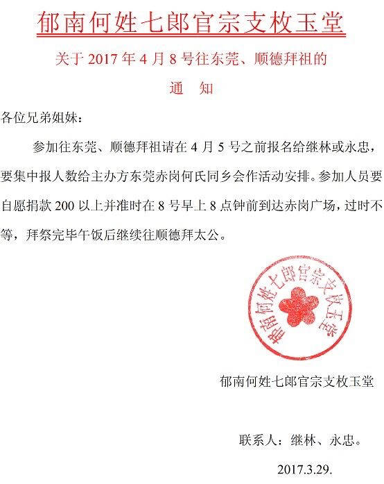 广东云浮郁南何姓七郞官宗支定于4月8日东莞顺德拜祖的通知