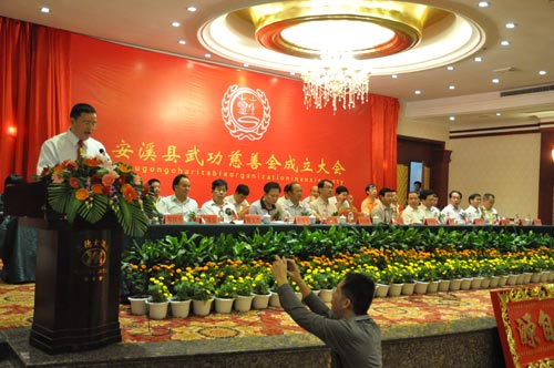 九时许,安溪县四套班子领导到会庆祝,全体人员举行隆重的合影仪式。九时三十分,三德大酒店四楼会议厅,宗亲代表、宾朋满座。“安溪县武功慈善会成立大会”横幅,十分醒目。