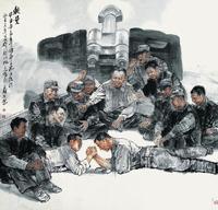 实践表明,现阶段的人物画创作,在反映现实生活、抒发人情怀中,写实表现仍然是深为人们所喜爱的。它直接介入生活,直接与人交流及生动鲜明的形象塑造、亲切的气息等等,都是无法替代的,都体现着特定时代的精神状态。他们学习、研究的结晶,是他们深入生活、讴歌生活收获的果实,是他们艺术历程的一次转折;【军民大团结】就是反应新疆人民正在高高兴兴欢迎温总理的到来,雪灾给给新疆人暂短的寒冷却让人们感觉到的党的温暖。这些作品,因其贴近现实、关注人生而体现出自觉的使命感,这是它们取得成功的重要经验。是部队给了他创作和学习的机会,所以他心里人民。他是人民的子弟兵重要的是,他们明确了画家及其艺术所承担的使命,明确了作为人物画家所要关注的生活本质,以及艺术与生活、艺术与人的紧密关系对艺术创作的至关重要性。 鹏飞多年来一直是非常关注时政,这个也给他的绘画提供了丰富的题材,许多特殊的历史时刻都牢牢的印在了他的大脑里。出现在的作品中。绘画中的人物画,仍然具有举足轻重的地位。创作了《吴起大捷》这幅作品,并在今年总政举办的纪念红军长征胜利70周年美术创作班上进行了修改完善。该画反映了中央红军长征到达吴起镇取得“切尾巴”战役胜利后军民同庆的感人场面,整个画面人物生动,气氛活跃,场面宏大,人物众多,得到了不少名家的高度评价。在伟大的时代中,孕育并产生了许多优秀的作品,深受人们的喜爱,激励着人们积极向上的理想追求、健康乐观的审美情趣。