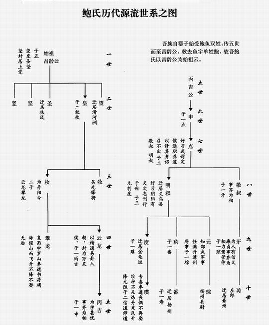 第一个问题:关于一世祖的定位,当今在族内或社会上一般都认定为“叔牙”公。但我们从贵池县香山鲍氏族谱所载“鲍氏宗原序”中查得:商末有达公,生子名婴,被周王赐“鲍鱼”双姓,封为办宝议奏郎,至周成王再加封百度侯,以柏檀公主妻之。婴生十子,有九子各随官爵,唯长子子范仍承袭复姓“鲍鱼”,受封御辰伯。子范生子名“极”,极生子名“宗实”,宗实生子名“昌龄”。昌龄公生资敏捷,凡书一览即通记之,周穆王奇其才,以林源公主妻之,并敕去鱼字,赐姓鲍,封之上党,则鲍氏之宗姓始于此。从这一段记载中可以看出,今天我全体鲍氏族人应尊奉昌龄公为一世祖。再者,贵池县香山鲍氏族谱中的“鲍氏历代源流世系之图”明确记载,叔牙公是继昌龄公之后的第九代孙。叔牙公父辈有敬叔和明叔兄弟两人:敬叔生一子即叔牙;明叔生三子,繁衍地域广阔,其中歙县鲍氏体系均为明叔第三子叔度公衍生而来。由此看来,如奉叔牙公为一世祖,则抹去了明叔公的祖制地位,不符合史实,非常不妥。另据查考,西周共和元年为公元前841年,此后已有历书记载,此前为断代,无年历记载,但从共和往前推至周穆王尚有六代君王,如此算来,我鲍氏自周穆王时始立姓至今已有三千年之久,延续九十余代,渊源流长。鲍姓在我国各姓氏中虽属小姓之列,但为显姓,而且也是起源很早的姓氏之一。