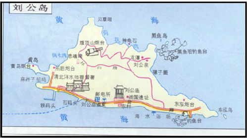光绪二十年十二月二十四日(1895年1月19日)其时,威海卫港内尚有北洋海军各种舰艇二十六艘。1895年1月20日,大山岩大将指挥的日本第二军,包括佐久间左马太中将的第二师团和黑木为桢中将的第六师团,共两万五千人,在日舰掩护下开始在荣成龙须岛登陆,23日全部登陆完毕。30日,日军集中兵力进攻威海卫南帮炮台。驻守南帮炮台的清军仅六营三千人。营官周家恩守卫摩天岭阵地顽强抵抗,最后被日军歼灭,日军也死伤累累,其左翼司令官大寺安纯少将被清军炮弹打死,这是日本在战争中唯一阵亡的将军。由于兵力悬殊,南帮炮台终被日军攻占。2月3日,日军占领威海卫城。威海陆地悉数被日本占据,丁汝昌坐镇指挥的刘公岛成为孤岛。日本联合舰队司令伊东佑亨曾致书丁汝昌劝降,遭丁汝昌拒绝。5日凌晨,旗舰定远中雷搁浅,仍做“水炮台”使用。10日,定远弹药告罄,刘步蟾自杀。11日,丁汝昌在洋员和威海营务处提调牛昶昞等主降将领的胁迫下,拒降自杀。洋员和牛昶昞等又推署镇远管带杨用霖,出面主持投降事宜,杨用霖最终自杀。12日,由美籍洋员浩威起草投降书,伪托丁汝昌的名义,派广丙管带程壁光送至日本旗舰。14日牛昶昞与伊东佑亨签订《威海降约》,规定将威海卫港内舰只、刘公岛炮台及岛上所有军械物资,悉数交给日军。17日,日军在刘公岛登陆,威海卫海军基地陷落,北洋舰队全军覆没。下图1是甲午战争双方进军路线图,图2为刘公岛现代地理图。
