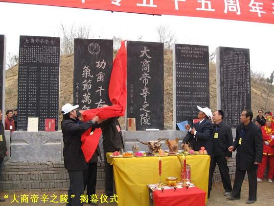 9时56分,北京2008年奥运会帆板冠军、中华殷氏网祭祖团名誉团长殷剑女士的父亲殷崇福先生,中华殷氏网站长殷作斌先生,中国古都学会常务理事王革勋先生,安阳殷氏宗亲会会长殷杰先生,安阳殷氏宗亲会副会长殷太高先生,淇县殷氏宗亲会会长殷福春先生,携手为“大商帝辛之陵”揭幕。揭碑后,6块青石大碑矗立在人们眼前,分别为“大商帝辛之陵”题碑、铭刻中华殷氏网祭祖团天圆地方正中伫立甲骨文“殷”字徽标的“功垂千古,气节万年”的题碑、毛泽东先生建国初期评价帝辛的有关论述碑、郭沫若先生为帝辛平反昭雪而写的诗咏大作碑、《大商帝辛祭文》碑、《祭殷辛王文》碑。揭碑现场一片肃穆,参加大典的全体成员无不为之感动,敬仰之情油然而生。