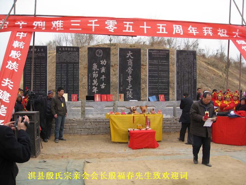 中华殷氏网站长、原淮阴工学院教授殷作斌代表中华殷氏网祭祖团讲话。他指出,“今天,我们在这里代表中华全国乃至海内外200余万殷氏族人,为蒙冤3000多年的先祖帝辛祭奠正名,重新建碑勒石,将史称《纣王之墓》易名为《大商帝辛之陵》,共同祭拜我们的先祖殷商末代君王帝辛,这是倍受世人瞩目的一件大事。”“尊重历史,是中华民族的优良传统。”“中华殷氏网祭祖团满怀海内外200余万殷商后裔的深情厚意,在这里隆重祭拜殷商王朝的开疆功勋、民族英雄、气节典范先祖帝辛,就是为了缅怀历史,展望未来,激励子孙,将我们的祖国推向更加美好的明天。我们坚信,只要我们万众一心,与全国人民一道,坚持中国共产党的领导,坚持走中国特色的社会主义道路,坚持改革开放,开拓进取,紧密团结在以胡锦涛同志为总书记的党中央周围,我们的理想一定会实现,我们的目的一定会达到,也一定能够达到!”