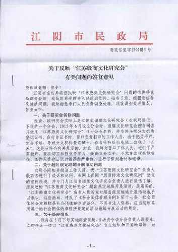 说明:不知因何种原因,上面发表的《江苏省江阴市民政局关于吊销违规组织“江苏殷商文化研究会”登记证书的决定》一文中政府正式文件的两幅图片在殷氏网中有时不显示。如果读者看不到江苏省江阴市民政局的这个文件,请点击打开下面的网址,观看江苏省江阴市民政局关于吊销违规组织“江苏殷商文化研究会”登记证书的决定的两幅图片: