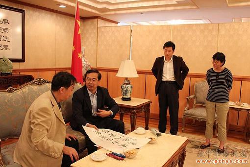 中华庞氏影响力人物庞中华先生向王民大使惠赠毛笔书法作品。