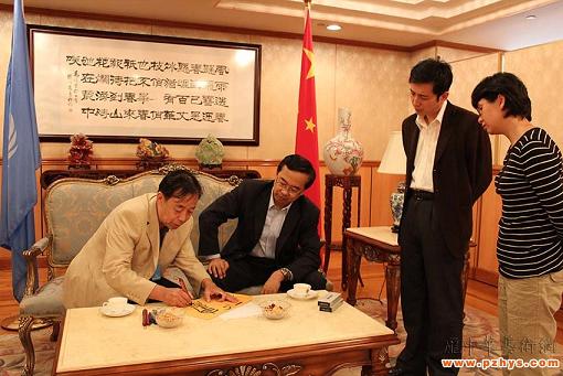 中华庞氏影响力人物庞中华先生向王民大使介绍新研制的《庞中华牌书法笔》的特色。