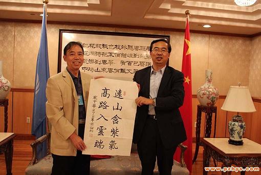 2012年6月13日,中华庞氏影响力人物庞中华应邀拜访中国常驻联合国代表团王民大使。(王昌芝摄影)