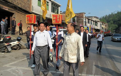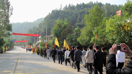 世房总会、中华房氏网两面黄旗打在队伍前列