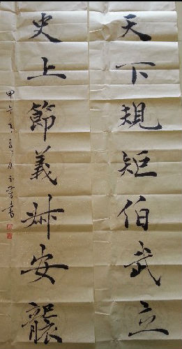 山东书画名家 房玉芳、深圳宝安书协主席李高扬老师 应邀所写书法“天下规矩 伯武立,史上节义 叔安袭。” 上联取自 东汉民间赞美 司空房植(字伯武)的歌谣“ 天下规矩 房伯武”;下联取自南北朝一贵人对 太守 房叔安的赞美之词“ 叔安节义,唯古人中求。”愿房家世世多出遵守社会公序良俗甚至引领社会风气的人才!