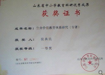 热烈祝贺:中华侯氏网论坛总管侯典民先生所进行的“生命价值教育体系研究”(专著),荣获山东省教育科学研究所2012年“山东省中小学教育科学研究优秀成果”一等奖。