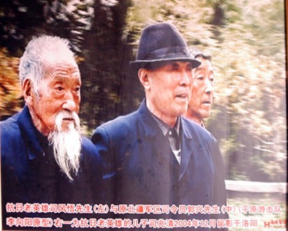 电影平原游击队李向阳原型为原北疆军区司令员郭兴(照片中),左一为他的老部下,平原游击队中的骨干队员司风悟,右为风悟老人的二子司兆清。摄于2004年。