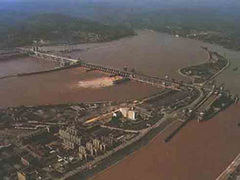 葛洲坝位于湖北省宜昌市区,离南津关3公里。葛洲坝水电枢纽全长2561米,高70米。巨坝共用混凝土1000万立方米,各类金属6.5万吨。如长虹卧波,横断长江。主要由大江电站、二江电站、1号船闸、2号船闸、3号船闸、泄洪闸、冲沙闸等组成。