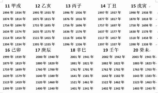 为了便于各地的宗亲编写家谱,特发公元1294年至2013年共720年各年的干支年号对照表。每个干支年号下列8个最近的公元年号。在1294年(31甲午)和2013年(30癸巳)下面分别加了横线,便于按顺序查阅。大家会发现这样的规律:以天干的甲、乙、丙、丁、戊、己、庚、辛、壬、癸开头的年份分别对应于尾数是4、5、6、7、8、9、0、1、2、3的公元年份(而公元前是以7、8、9、0、1、2、3、4、5、6为尾数的年份分别对应于以甲、乙、丙、丁、戊、己、庚、辛、壬、癸开头的干支年份)。