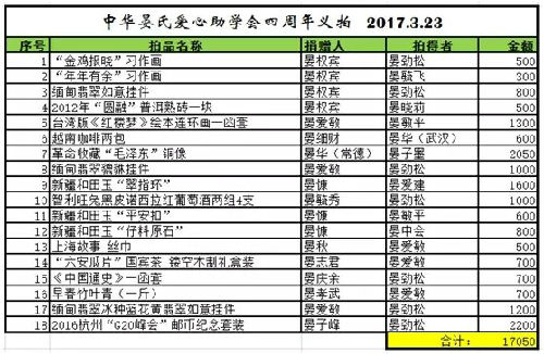 在晏氏爱心助学会四周年的纪念日里,我们举行了一场义拍,一来为今年9月份助学金不足筹款,二来借此四周年之际以义拍的方式做个纪念,三来希望有更多的晏家人参与到晏氏爱心助学中来。所拍卖产生的款项都纳入助学金里。2017年3月23日20:00整开始,在中华晏氏爱心助学会微信群,历时两小时的义拍,热情活跃,也深深提现了我晏氏后裔大爱无疆的精神,18件拍品最后拍得善款17050元。晏劲松宗亲首次参与爱心助学会的活动,他慷慨出手,积极奉献,一举拍得七件拍品,我想或许他并不是真的迫切需要这些物品,而是那份付出爱心的真情!!!真心感恩,感恩所有参加活动的宗亲们!