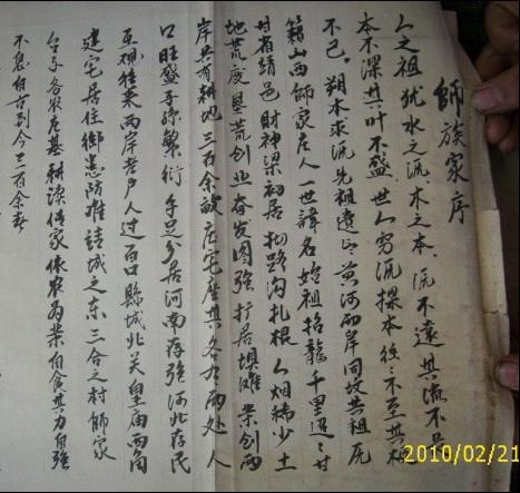 2010年2月21日,师玉堂提供靖远县《师氏家谱》照片4张。第一张是家谱的封面,第二张是家谱序言,第三张是字辈表,第四张是先祖神位图。
