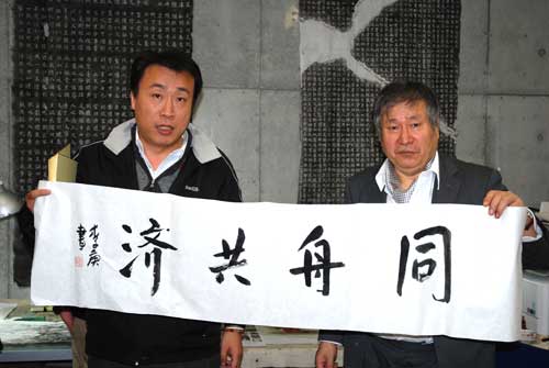 12月9日,日本《关西华文时报》邀请中国画家李可染在日本的儿子李庚题写2011年中日关系最流行熟语“同舟共济”这个当选结果。李庚是日本京都造型艺术大学教授,著名书画家,图为李庚(右)向日本《关西华文时报》总编辑丛中笑(左)赠送这个条幅。(日本《关西华文时报》)