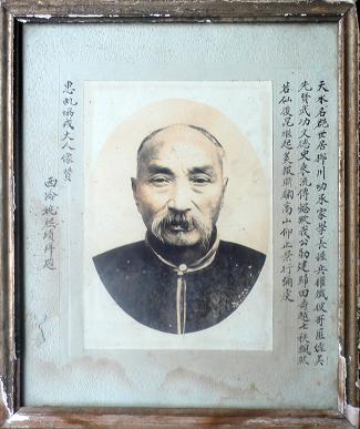 我来到上官育乔的曾孙——今年已经86岁的上官文鵷老先生家中,他拿出了一张保存得还非常完好的相片。老人告诉我,这就是他的太公——上官育乔。当我接过一看,就被这张相片惊呆了!这是一张摄于清宣统元年即公元1909年的老相片,是一张遂昌乃至丽水市,迄今为止发现的第一张历经百年沧桑的人物老相片。相片两边还有用小楷写的像赞,是100年前,杭州西泠印社姚熙绩拜题的。相框的背面,还书写了“宣统元年,时年73岁”的字样。因年代久远,红色的字迹已褪成淡色,这更说明了这张老相片真实可靠,使相片更弥足珍贵。