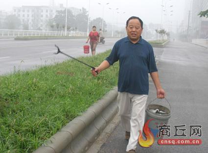 近段时间,长江路与中州路交叉口附近的居民发现,当他们早起晨练的时候,经常会看到一对衣着朴素的夫妇拿着桶和夹子等工具捡花坛内和附近居民休闲广场内的垃圾。